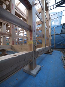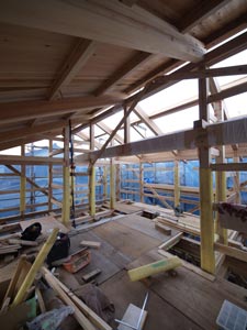 小屋は登り梁で構成している為、広々とした空間になっています。8メートルの地棟をはじめ、長尺材を多く使っています。