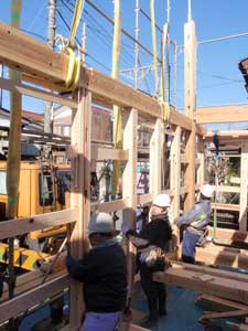 足場に建てかけてあった壁面全体を一気に組み付けます。