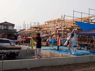 敷地の角迄、棟梁送りを行いました。昔は直会の後、棟梁宅迄送り引き続き宴会を行った様です。
