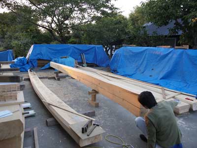 小屋仮組途中の様子です。太鼓登り梁は、西川桧です。