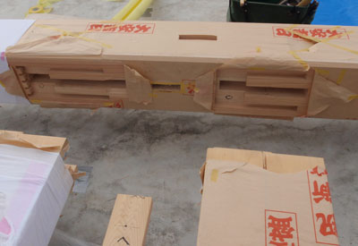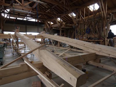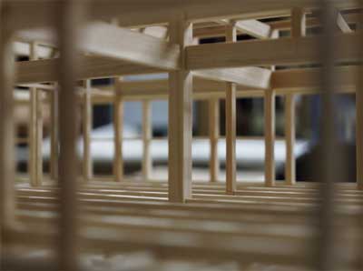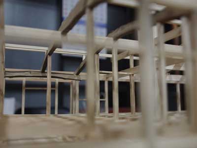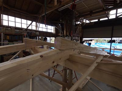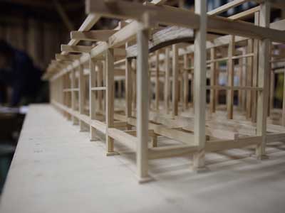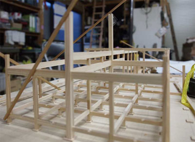 模型製作の途中です。恵比寿柱側から大黒柱方向を見ています。両柱共に棟木までのび、小屋組を一体化させます。
