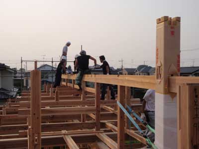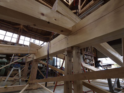 瓦を載せると軸組が締め固まります。あらかじめめり込む様にしてある接合部が馴染み合います。