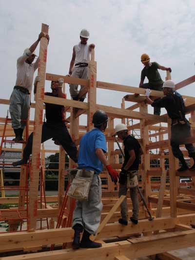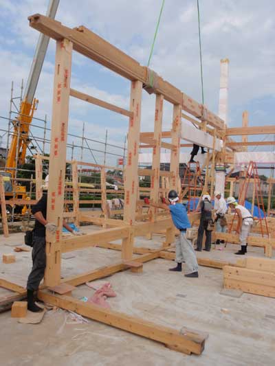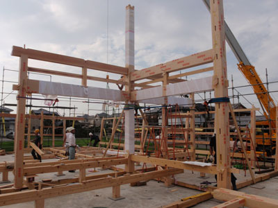 大黒柱と小大黒柱、差し鴨居などを建てている様子です。