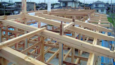 建て方も終盤、小屋梁がほぼ納まった状態です。この上に屋根が載ります。出し桁は外壁から2尺の出、軒はそこからさらに3尺出ます。